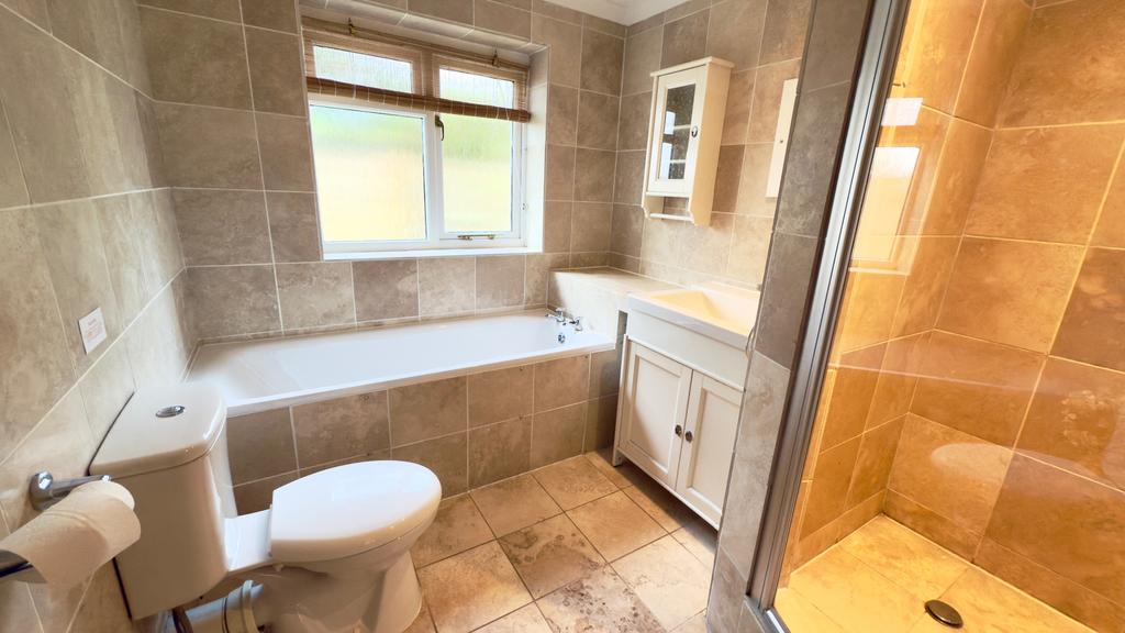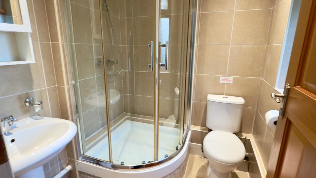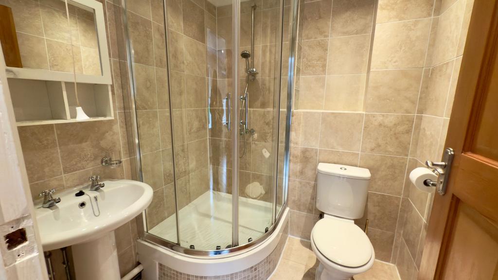 Obscured double-glazed sealed unit window to the rear. Fully tiled walls. Pedestal wash basin. Close coupled WC. Medicine cabinet. Shower cubicle which is also fully tiled with glass shower screen. Recessed spotlights to the ceiling. Tiled floor.