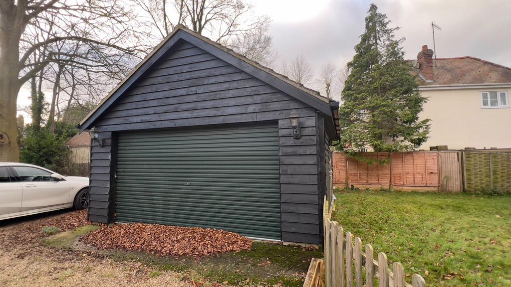 Detached Garage/games room with courtesy door. Garden shed behind.