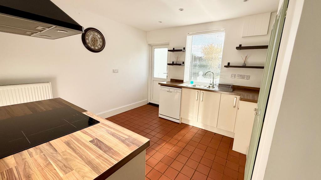 With double-glazed window and door to the rear. Wood effect worktop with inset single drainer 1 1/2 bowl stainless steel sink unit. Range of base units. Eye level cupboard. Built-in larder cupboard. Built-in double oven with electric Induction hob above and extractor chimney. Dishwasher. Double radiator. Quarry tiled floor. Step leading upto