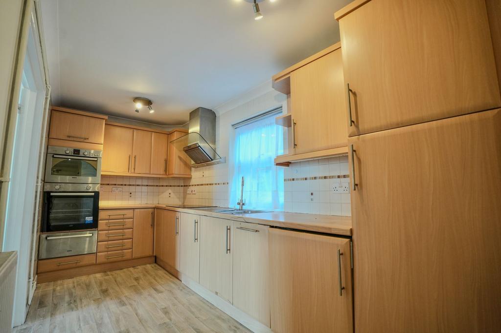 uPVC double glazed window to the rear aspect, a range of fitted base and wall mounted units with work surfaces over, inset one and a half bowl stainless steel sink with mixer tap over and side drainer, built-in double oven and grill with built-in plate warmer below, inset four ring electric hob with extractor over, integrated slimline dishwasher, integrated washing machine, integrated fridge freezer, part tiled walls, wall mounted radiator, wood effect vinyl flooring, decorative coving and part glazed double opening doors to the lounge.