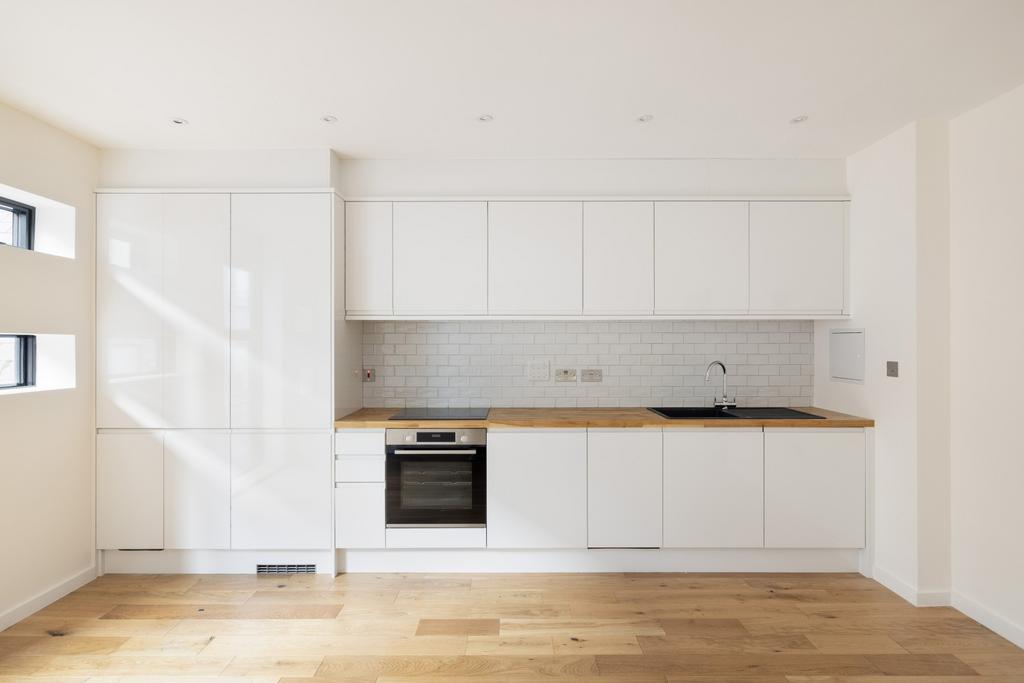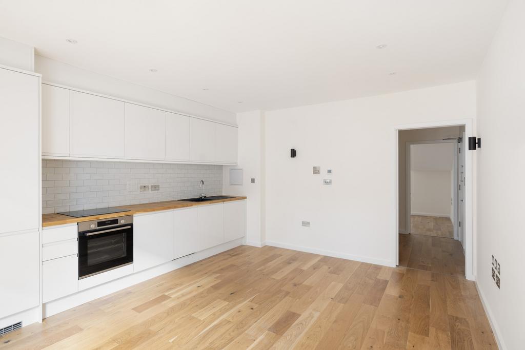 This first-floor, one-bedroom apartment has an open-plan living/dining space that is calm and well-considered, with a kitchen fitted with Bosch appliances and under-counter lighting that gives a gentle emphasis to the clean lines of the cabinetry. The bedroom includes built-in wardrobes and floor-to-ceiling doors. The bathroom is arranged around a walk-in shower with a contemporary finish. Engineered oak flooring runs throughout, reinforcing the apartment’s pared-back material palette.