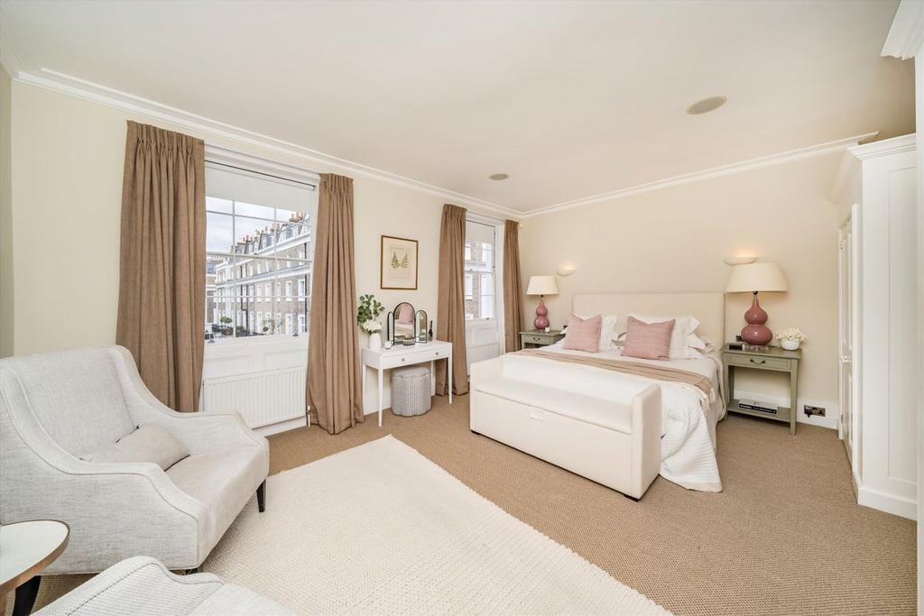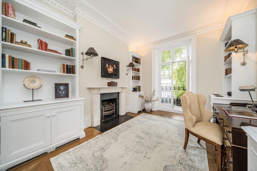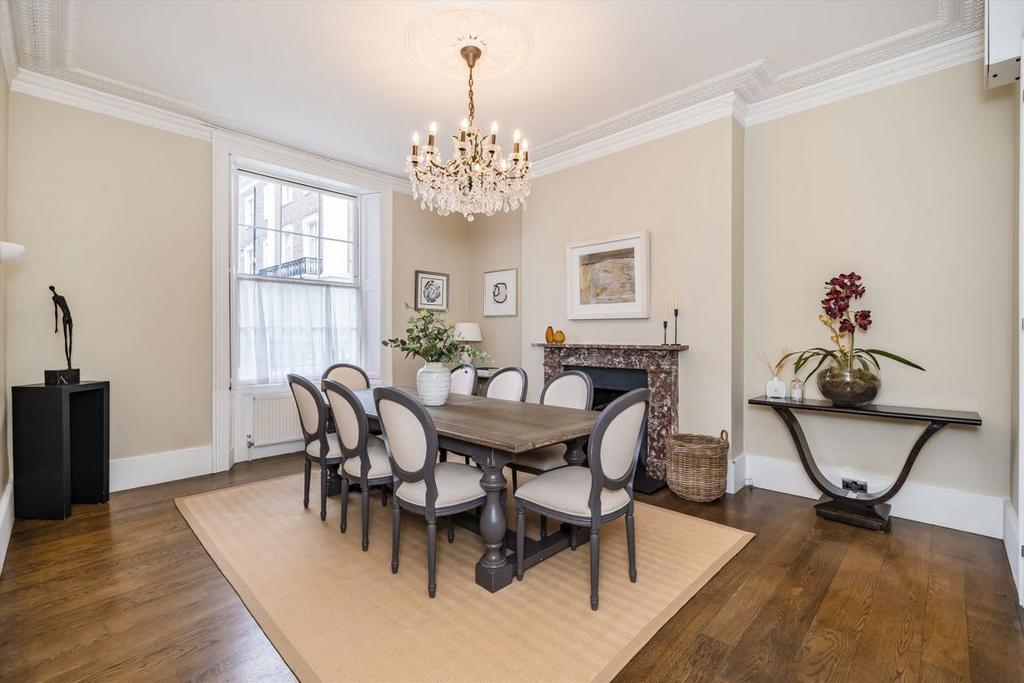 The principal entertaining areas are arranged across the ground and first floors, benefitting from traditionally high ceilings (c. 3m), excellent natural light throughout, and wonderful views over the square. These include a grand formal drawing room and a spacious dining room adjoined to the kitchen, comfortably seating ten guests.