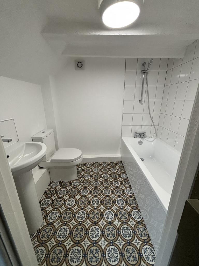 House Bathroom:White bathroom suite including bath with shower over and shower screen, fully tiled around bath, wash basin and W.C., heated towel rail, extractor fan and period style, vinyl flooring.
