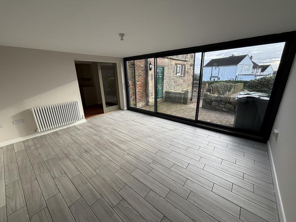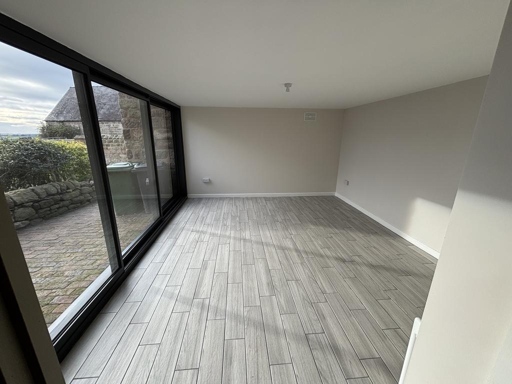 Extension: Large single storey extension accessed via a pair of double-glazed doors from the kitchen. Solid wall on three sides, with a full width glazed sliding door on one side, leading out on to a small patio.