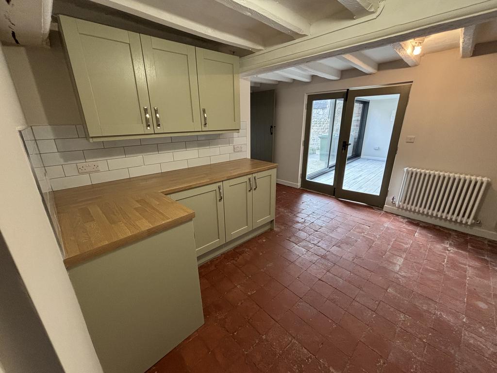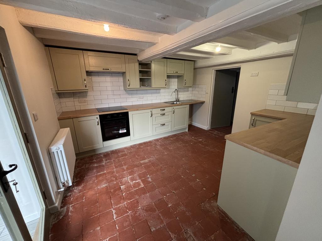 Kitchenwith range of pale green wall and floor units, beech effect worktops, tiled splashbacks, stainless steel sink unit and drainer, built-in electric cooker with ceramic hob and extractor above. Traditional solid, clay tiled floor.