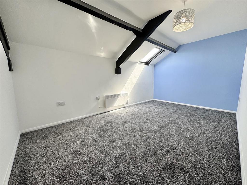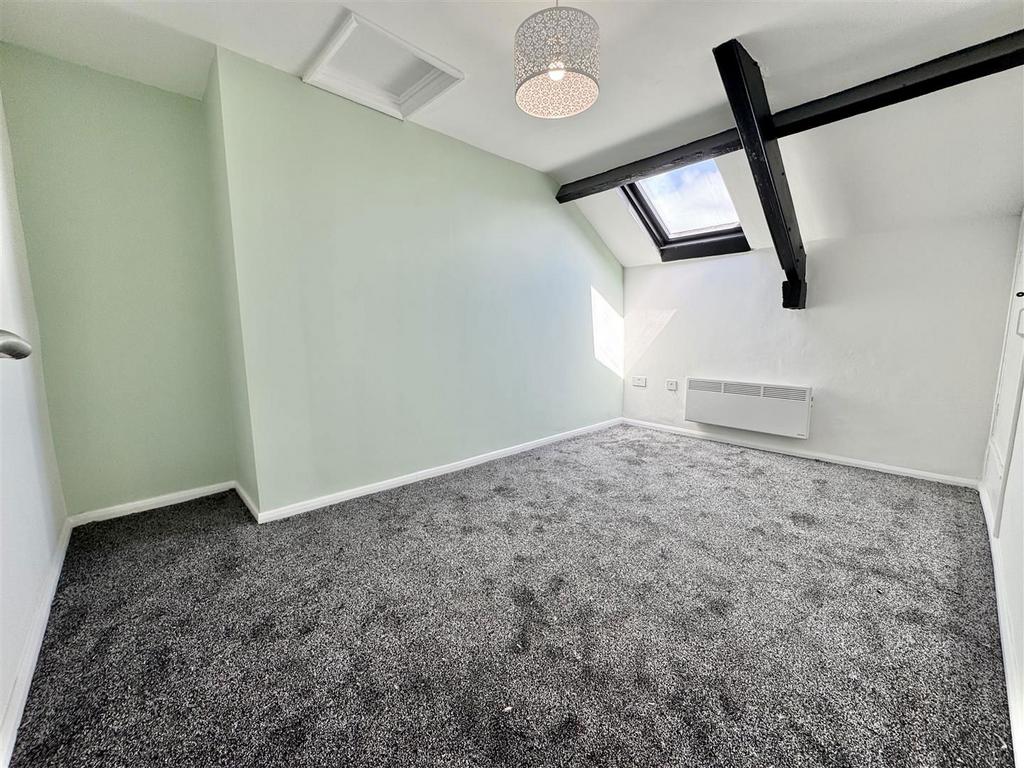 Velux roof window to the rear aspect, loft access hatch, exposed beams, storage cupboard, radiator and a carpeted floor.