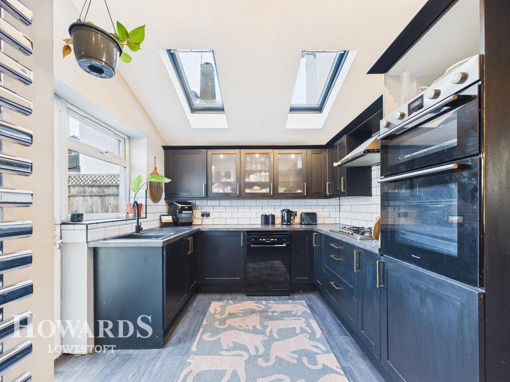 Full range of wall and base mounted storage cupboards set around extended work surfaces with inset stainless steel sink with mixer tap, built-in gas cooker with hob and integrated overhead extraction hood, slot for washing machine, dishwasher and fridge/freezer, wood effect laminate flooring, sealed unit double glazed windows and doors, power points, sealed unit double glazed window to rear aspect, radiator, 'Velux' windows, radiator.