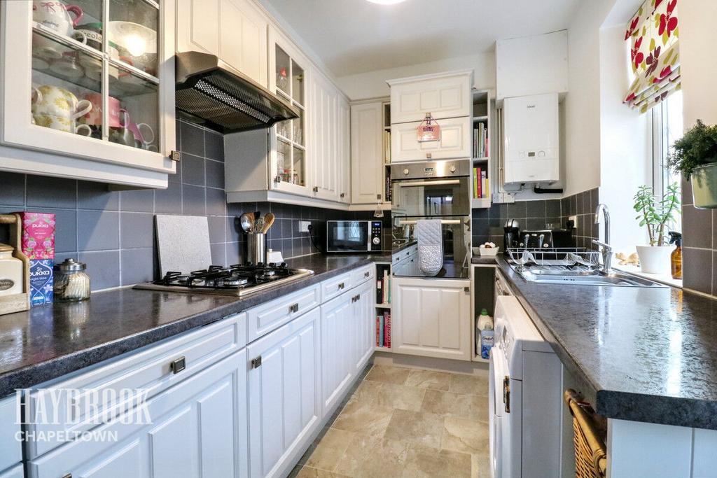 Side facing external door, radiator, wall and base units, gas hob, extractor hood, mid-level oven and grill, inset sink with drainer, space and plumbing for washing machine, side facing window.