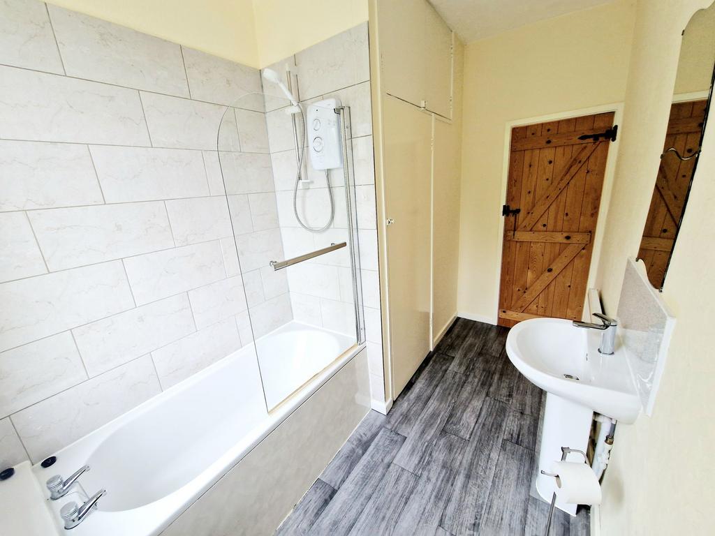 From the landing, there are doors to the double bedroom and the bathroom. The bedroom includes fitted storage, and the bathroom has a white suite with a shower over the bath.