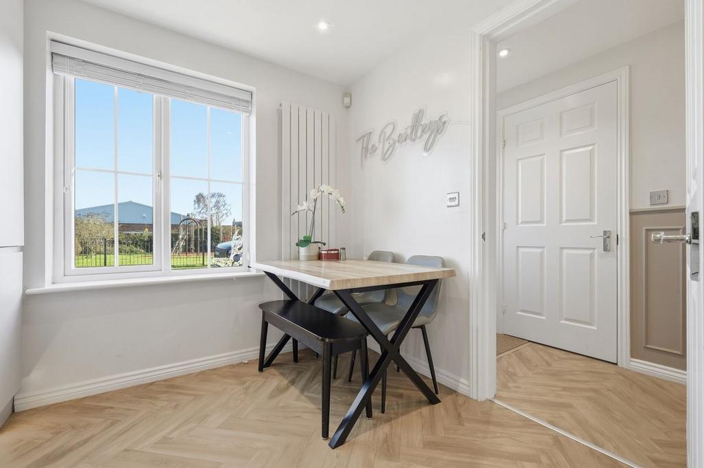 Abt. 14' 4" x 8' 10" (4.37m x 2.69m) A well-appointed kitchen/breakfast room comprising a comprehensive range of eye and base level units with ample quartz work surfaces and lighting under. Single drainer one and a half bowl sink unit. Built-in induction hob with extractor hood over and splashback. Eye level electric oven and microwave combi-oven. Integrated fridge/freezer, dishwasher and space for washing machine. Cupboard housing boiler. Radiator. Telephone point. Double glazed window to front. Inset ceiling lights. Luxury herringbone vinyl flooring.