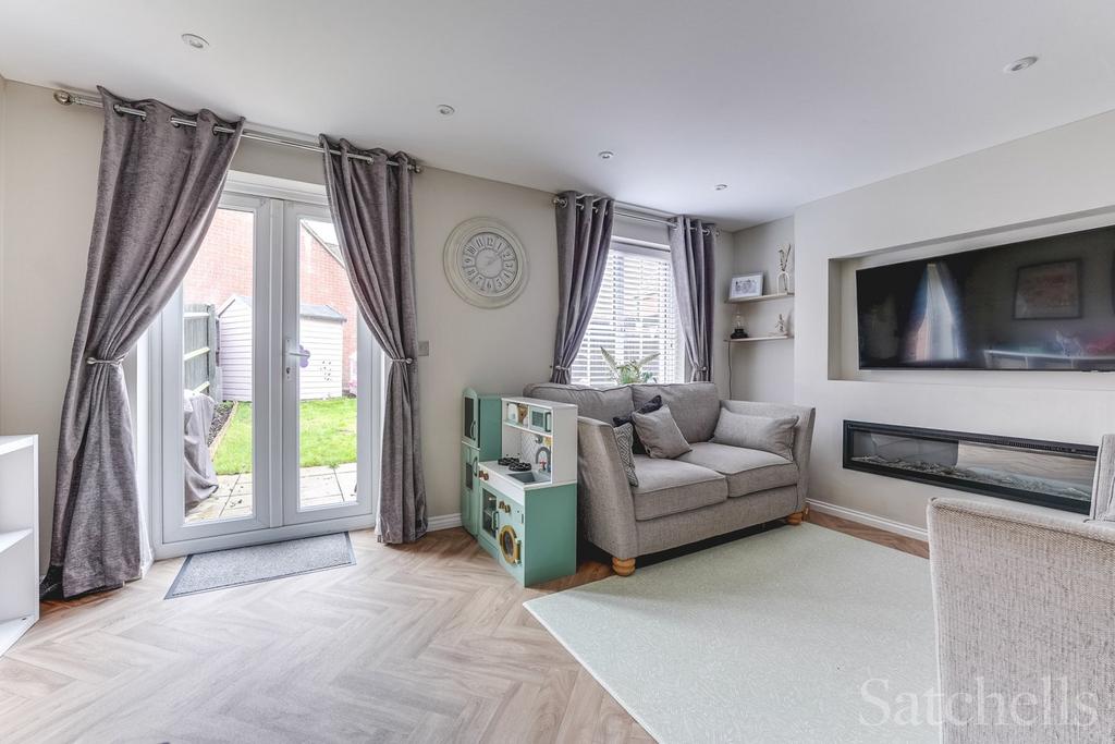 Abt. 11' 5" max x 16' 1" (3.48m max x 4.90m) A stunning living room with a feature media wall incorporating a contemporary style fire. Double glazed French doors leading to the rear garden. Double glazed window to rear. Television and telephone points. Two radiators. Inset ceiling lights. Luxury herringbone vinyl flooring.