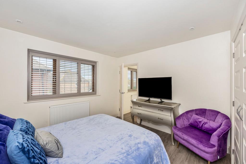 Another good size double bedroom, laid with ‘Alloc’ flooring, with fitted wardrobes, space for a king size bed and additional freestanding storage with a uPVC double glazed window to the front fitted with plantation-style shutters.