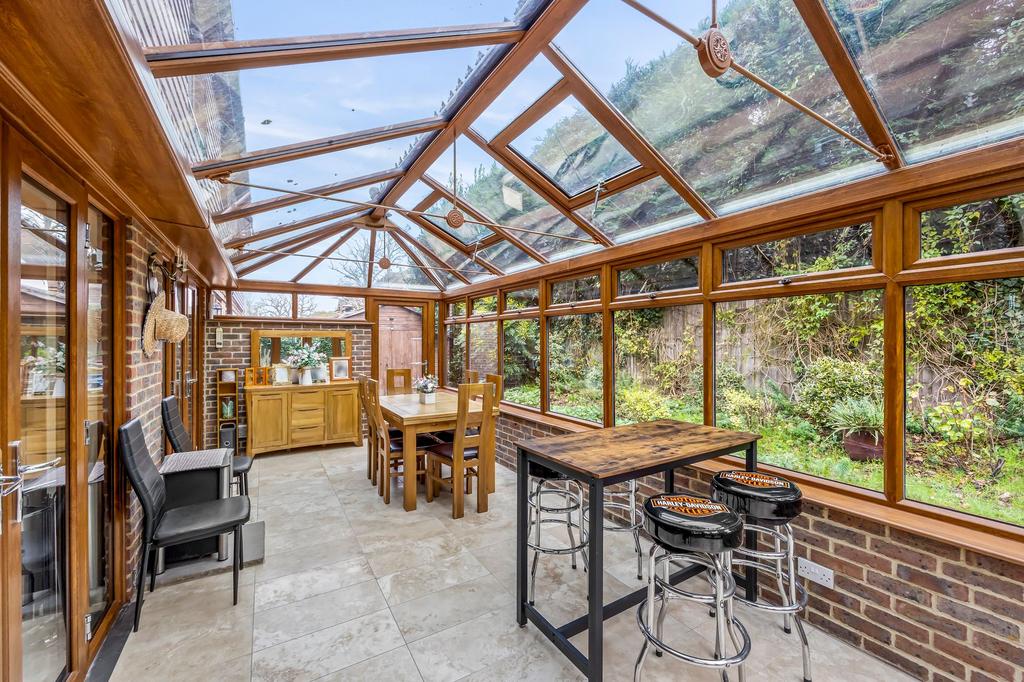- Fitted kitchen with integrated and freestanding appliances with dining space; conservatory off back of house