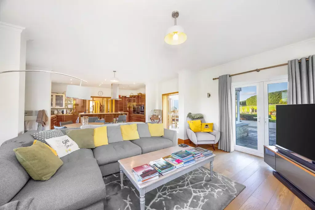 This modern detached country residence sits within magnificent wrap-around gardens and approximately seven acres of private fields and paddocks, offering an exceptional lifestyle for families seeking space, privacy and a deep connection to the countryside. Its idyllic south-facing setting captures uninterrupted rural views while remaining conveniently placed on the edge of Douglas, creating a rare balance of tranquillity and accessibility.