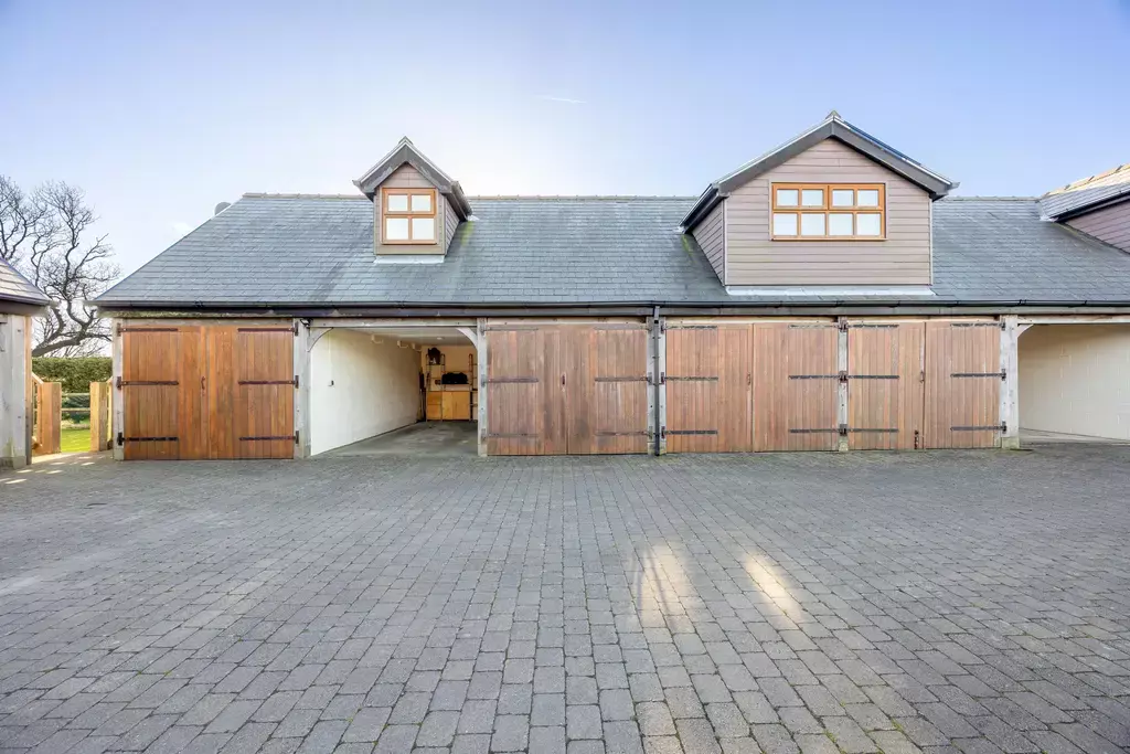 - Garage with mezzanine storage area, two stables, three field shelters and a timber stable currently being used as a garden store room