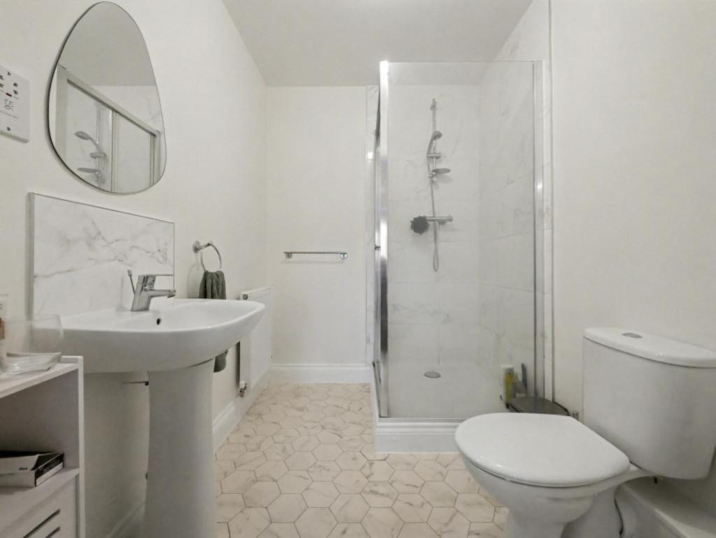 EN-SUITE SHOWER ROOM Fitted white suite comprising shower, pedestal wash basin and low level w.c, tiled splashbacks, radiator and shaver point.