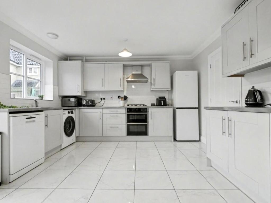 KITCHEN/DINING ROOM Approx 18' 2" x 12' 5" (5.54m x 3.78m) Fitted contemporary white gloss kitchen with stainless steel sink and drainer and window above overlooking the rear garden, Neff gas cooker with extractor hood, Amica dishwasher, Hisense washing machine, Fridgemaster fridge/freezer, dining space, tiled marble style floor, cupboard housing the Therma boiler, double doors to the sitting room and another set to the rear garden with garage and driveway beyond. All white goods are available by separate negotiation.