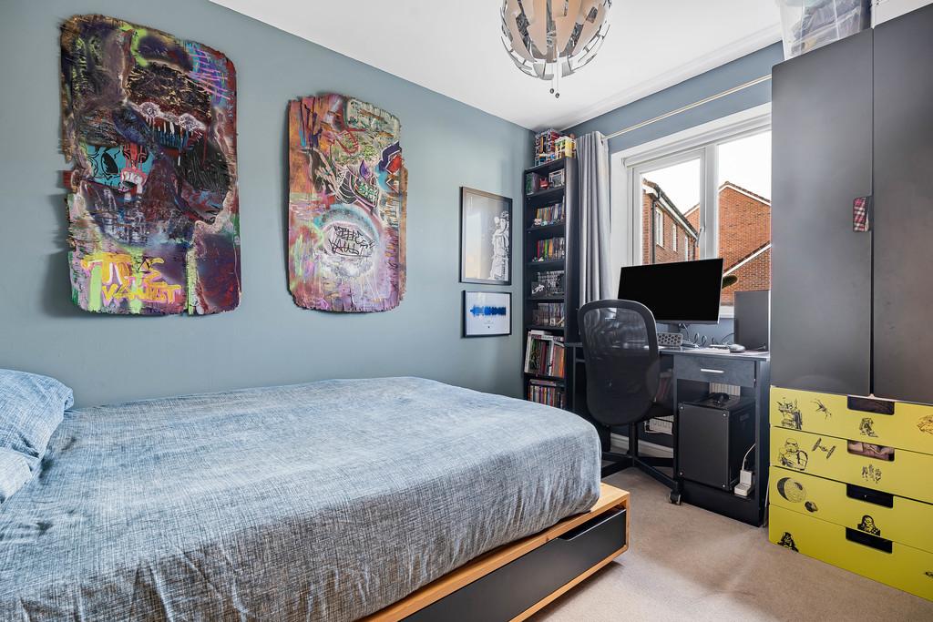 Upstairs, the principal bedroom is a generously sized double, complete with an en‑suite shower room featuring a tiled shower, WC, wash basin, and heated towel rail. Two further bedrooms, one double and one single providing versatile accommodation for family living or guest space.