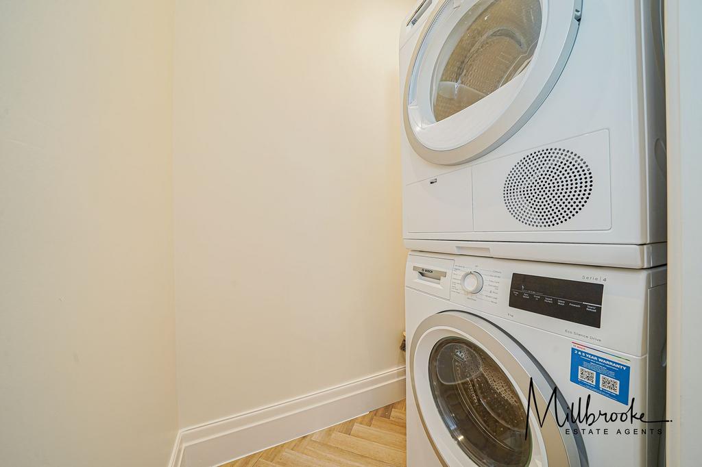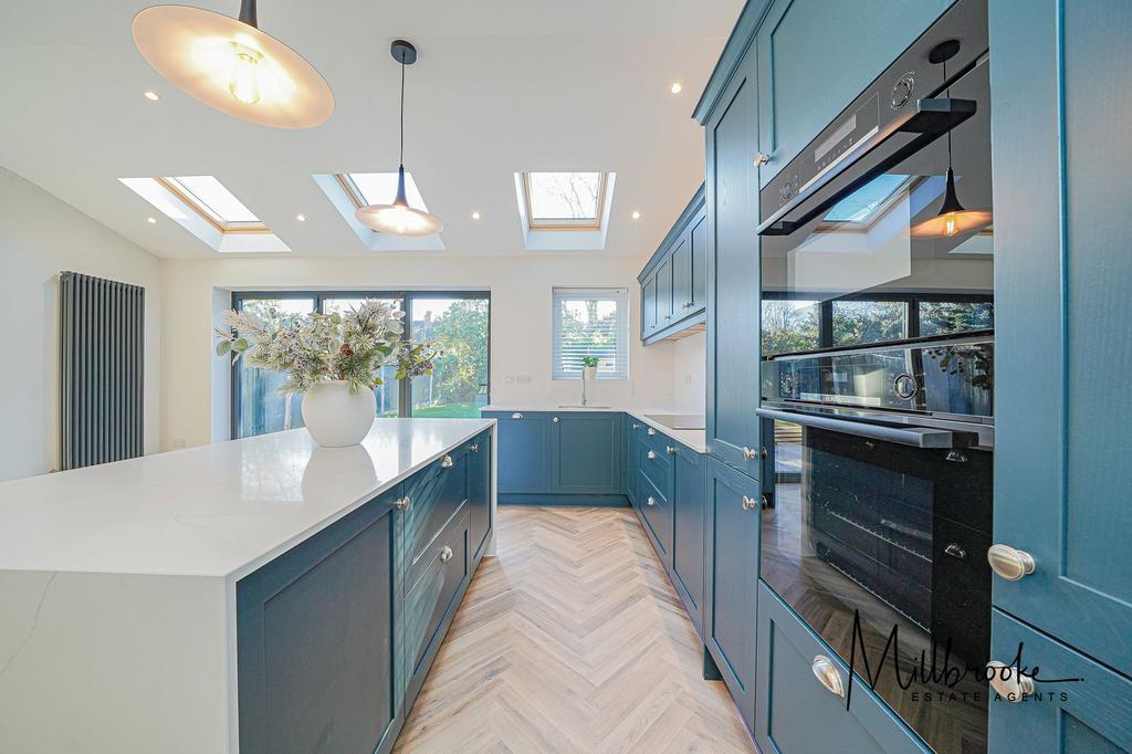 Comprising an entrance hall with an understair guest W/C, a spacious front lounge/sitting room complete with a bay window and an electric log burning stove. To the rear elevation is a large open plan kitchen/family room with a lounge area, dining space, kitchen, and bi-fold doors opening to the patio. This impressive space is flooded with natural light owing to its south-facing position and three Velux skylight windows. The lounge space boasts a stunning brick fireplace with an electric log burning stove, and the kitchen features blue wooden shaker cupboards and complementary quartz worktops. Integrated appliances include a Bosch fan oven, Bosch microwave, Siemens 5-ring induction hob, Bosch fridge/freezer, and an integrated dishwasher. A separate laundry room offers the perfect storage space and houses a stacked free-standing Bosch washer and condensing dryer.
