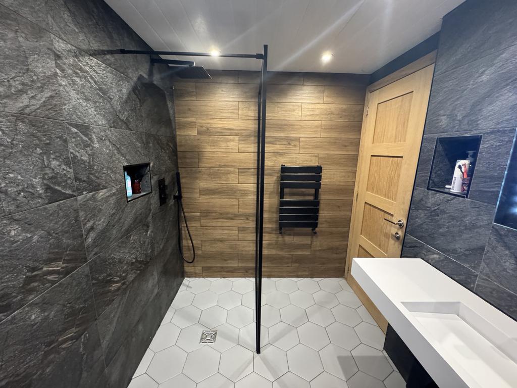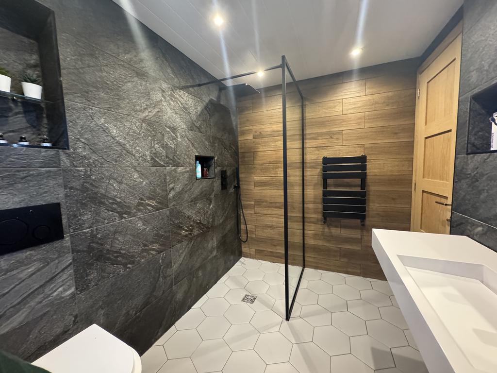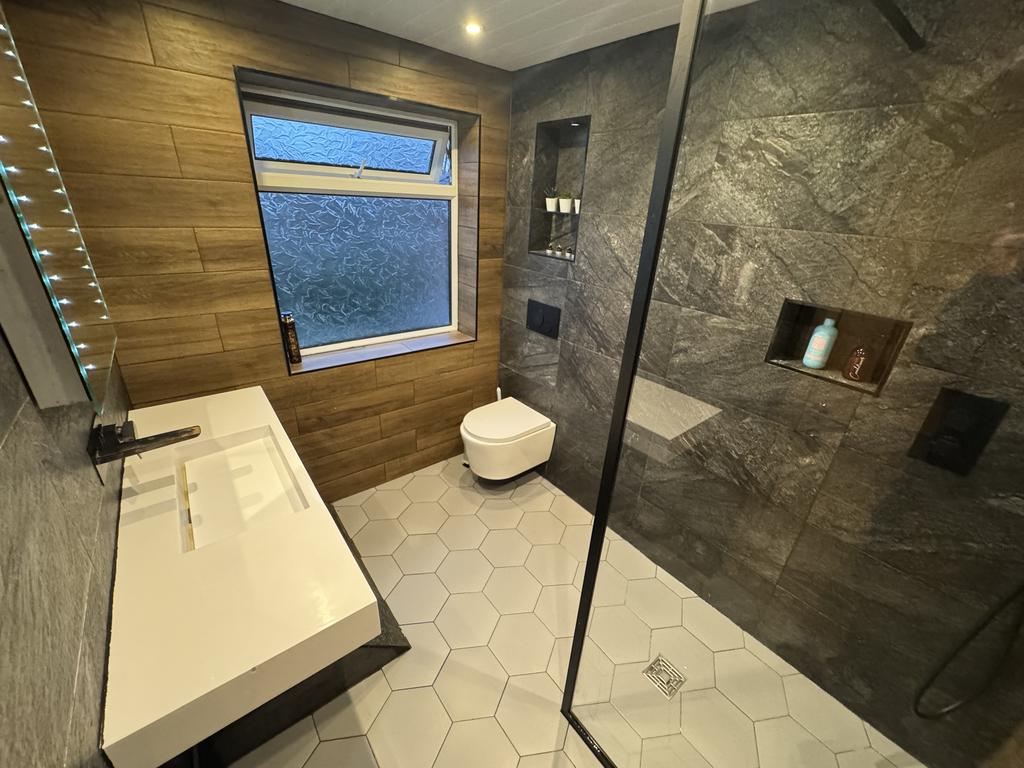 Inside, you’ll find modern fittings with integrated USB ports, a stylish Wren kitchen with Quartz worktops, and high-quality Bosch/Neff fitted appliances. The bathroom showcases luxury with a Lusso Stone AURA 900mm wall-hung stone basin, complemented by underfloor heating in the bathroom, kitchen and hallway for year-round comfort.