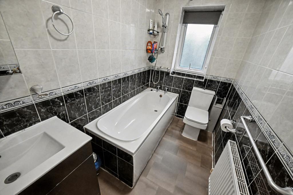 Bathroom: 8’9’’ (2.67m) x 4’11’’ (1.51m) Fitted with a white suite comprising panelled bath with shower unit over, low level WC, vanity unit, radiator, tiled walls, coved ceiling, vinyl flooring and double glazed opaque window to rear.