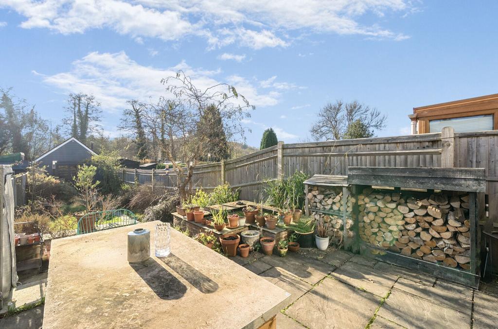 The south-facing rear garden features a full-width patio, a pond, and steps leading up to a lawned area. A pathway extends to the garage and workshop, which benefits from private off-road parking. The garden also includes fruit trees and a tranquil seating area beside the river, an ideal spot for morning coffee and the chance to spot a kingfisher.