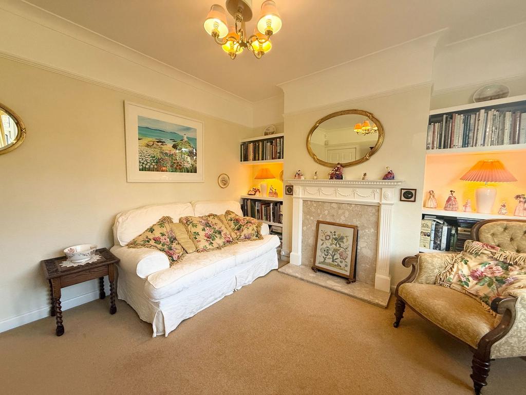 The property is approached via a private driveway leading to the garage and main entrance. Inside, the welcoming entrance hall features an attractive stained-glass window to the front and a charming nook. A door opens into the elegant front reception room, where a large bay window allows natural light to stream in and a feature fireplace adds warmth and character. To the rear, a spacious second sitting room offers plenty of room for both living and dining, complete with another feature fireplace and sliding doors opening onto the block-paved patio area, perfect for entertaining or relaxing.