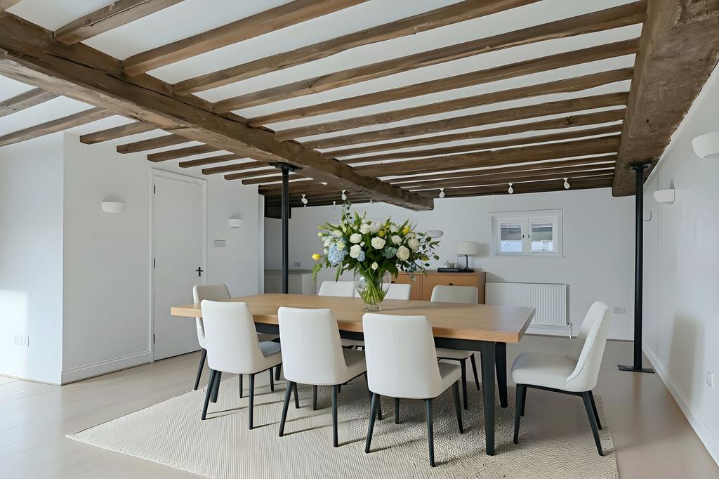 From here, the ground floor opens into a spacious open-plan living area that runs the full depth of the property. Engineered oak flooring adds a premium feel, and the ceiling beams create a beautiful sense of character. There is ample space for both lounge and dining furniture beside the kitchen. French doors open directly onto the courtyard, allowing easy movement between indoor and outdoor spaces, and several windows ensure the room stays bright throughout the day.