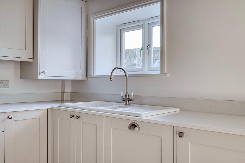 The kitchen sits at the rear and is finished with modern fitted shaker-style units in a soft neutral palette. The room features tile-effect vinyl flooring along with a tiled splashback that runs behind the worktops and cooking area. Integrated appliances include a double oven, gas hob and extractor, with space and plumbing for further appliances. The work surfaces wrap around three sides, creating a practical cooking layout, and timber beams continue through this room to maintain the natural charm of the ground floor.