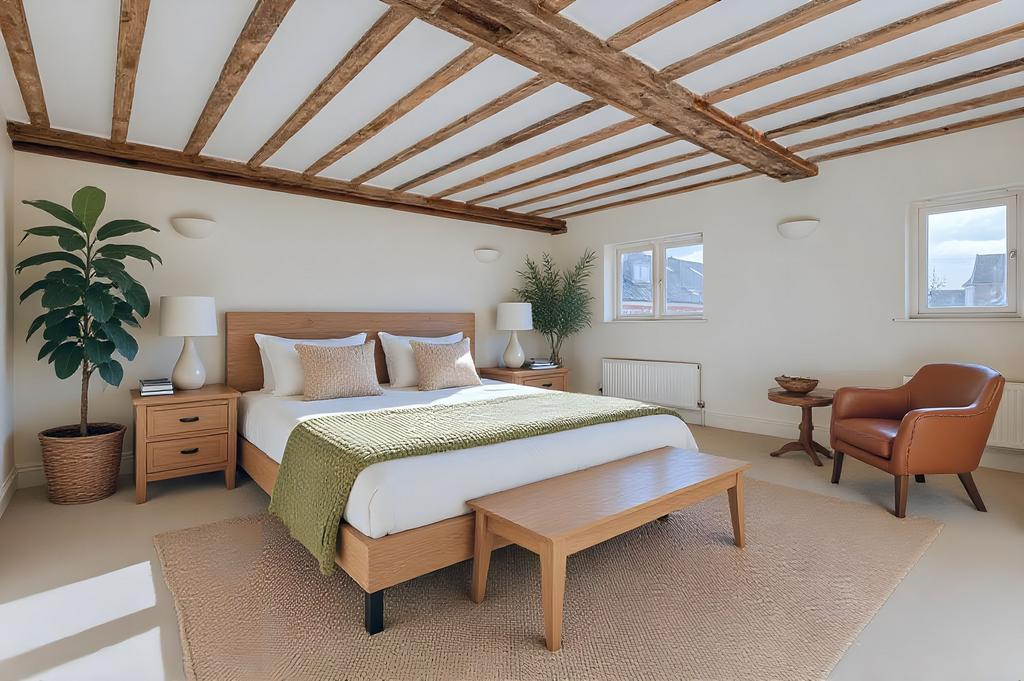The top floor reveals a striking and expansive room that can serve as a double bedroom or a versatile living space. Exposed timber posts and beams create a standout feature, while a skylight and a dormer window fill the area with natural light. The generous floor space allows for a sleeping area with room for a dressing or seating setup. Practical eaves storage is accessible from both the landing and the room, helping to keep the space organised.