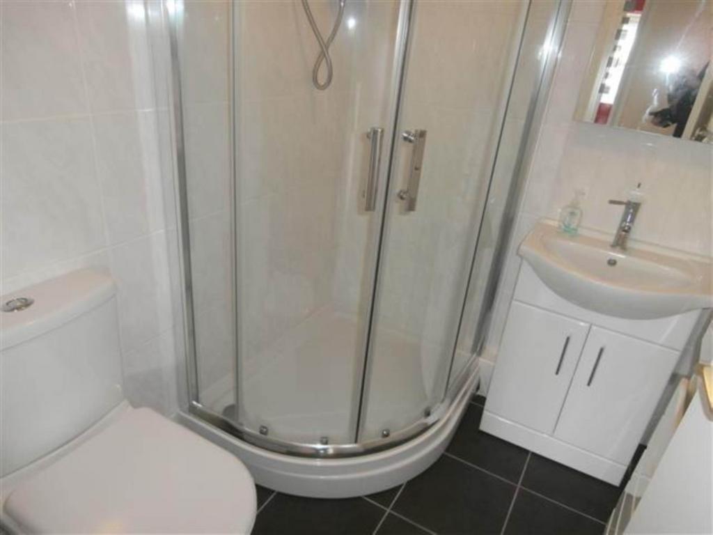 Ceramic tiled walls and floor. White suite comprising corner shower unit with glazed doors and fitted electric shower unit. Vanity unit with wash hand basin and low level w.c. Heated towel rail incorporating programmable convector heater. Drop light switch.