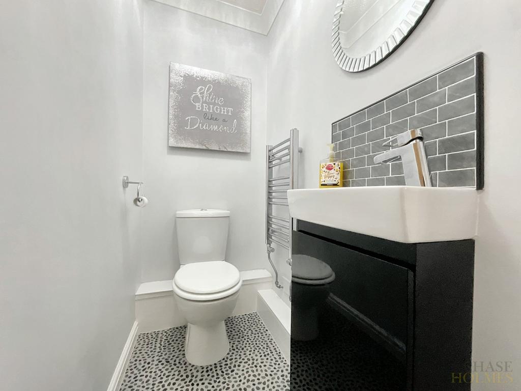 Features: coving to ceiling, low level WC, vanity wash basin, walk-in shower cubicle, heated towel rail, UPVC double glazed window.