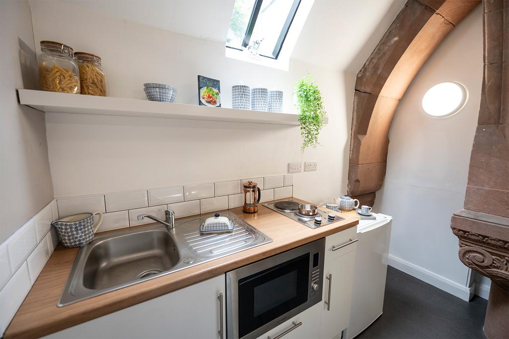 - Kitchen with hob, microwave and fridge with freezer compartment