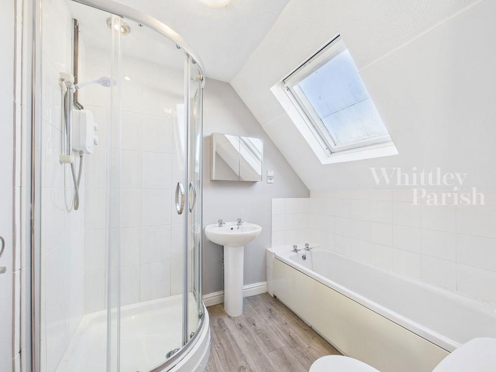 Comprising corner shower, panelled bath, wc and hand wash basin. Velux window.