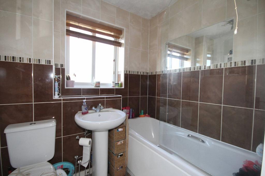 Bathroom: Obscure window to front elevation, part tiles walls comprising low level WC, pedestal wash hand basin, panelled bath with mixer taps and shower attachment over, ladder style radiator.