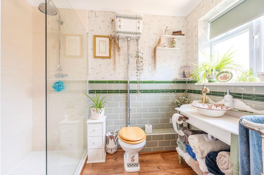 Five bedrooms are arranged over two levels. Three sit on the ground floor and offer comfortable private accommodation for family members or visiting guests. The upper floor includes two further bedrooms, each enhanced by Velux windows that bring in soft natural light. A WC sits just off the landing and features a traditional high-level cistern, which adds character to the upper floor.