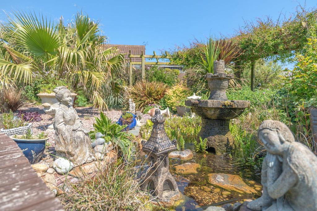 - Botanical west facing garden featuring winding pathways, mature palms, vibrant planting, a decorative pond with water feature, a painted summerhouse and an impressive glazed garden walkway
