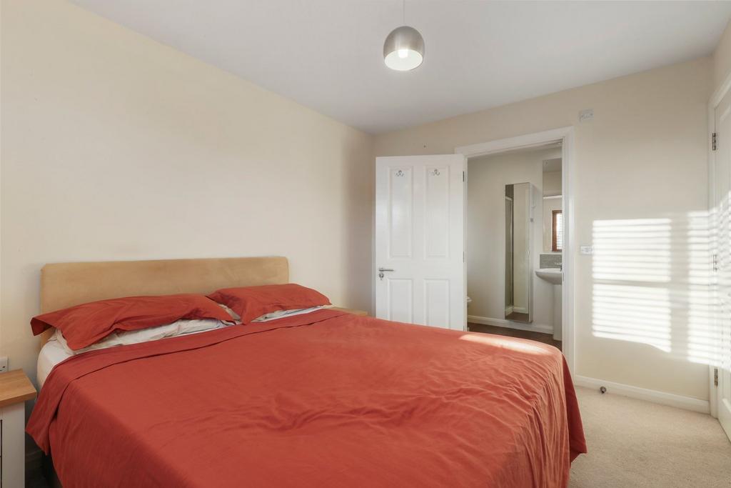 With carpet underfoot in this generous bedroom, with space for a king-size bed and additional freestanding furniture, along with direct access to the en-suite. A side-aspect window is fitted with light oak venetian blinds.
