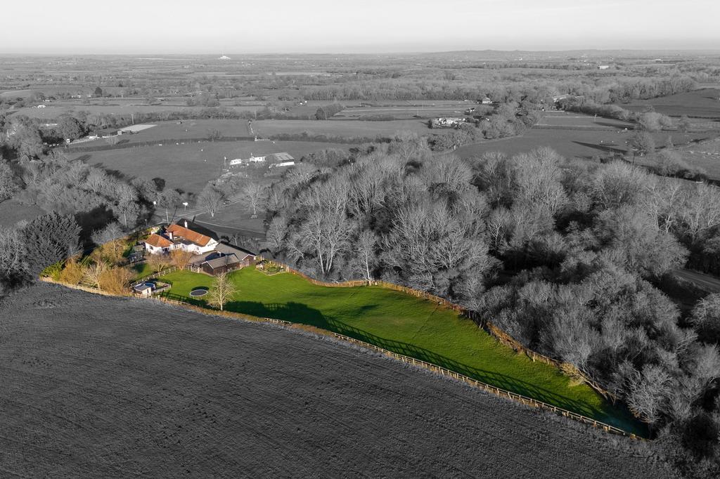 Through the entrance gate is a large tarmac driveway and parking area, with an adjacent stable block incorporating tack room and stores, workshop and a double garage.