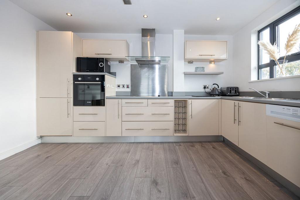 From the moment you step inside, the apartment feels bright, uplifting and beautifully laid out. The impressive open-plan living and kitchen space is the heart of the home, featuring sleek integrated appliances and a seamless flow onto a generous south-facing terrace—the perfect spot for morning coffees, evening unwinds or simply soaking up all-day sunshine.
