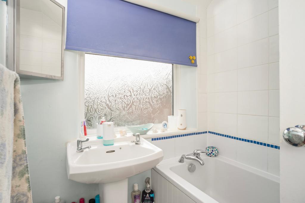 BATHROOM Fitted with a white suite comprising a pedestal wash-hand basin and bath with mixer tap and ‘Triton’ electric shower over, complementary wall tiling to the bath area, radiator, uPVC double-glazed window to the rear aspect.