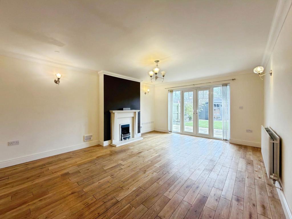 At the end of the hallway, the living room offers a wonderfully comfortable environment for relaxing, featuring ample space for furniture and a contemporary gas fire set into a stylish surround, creating an inviting focal point. French doors open out onto the rear garden, enabling that perfect indoor-outdoor flow during the warmer months and making the room feel beautifully connected to the outside space.