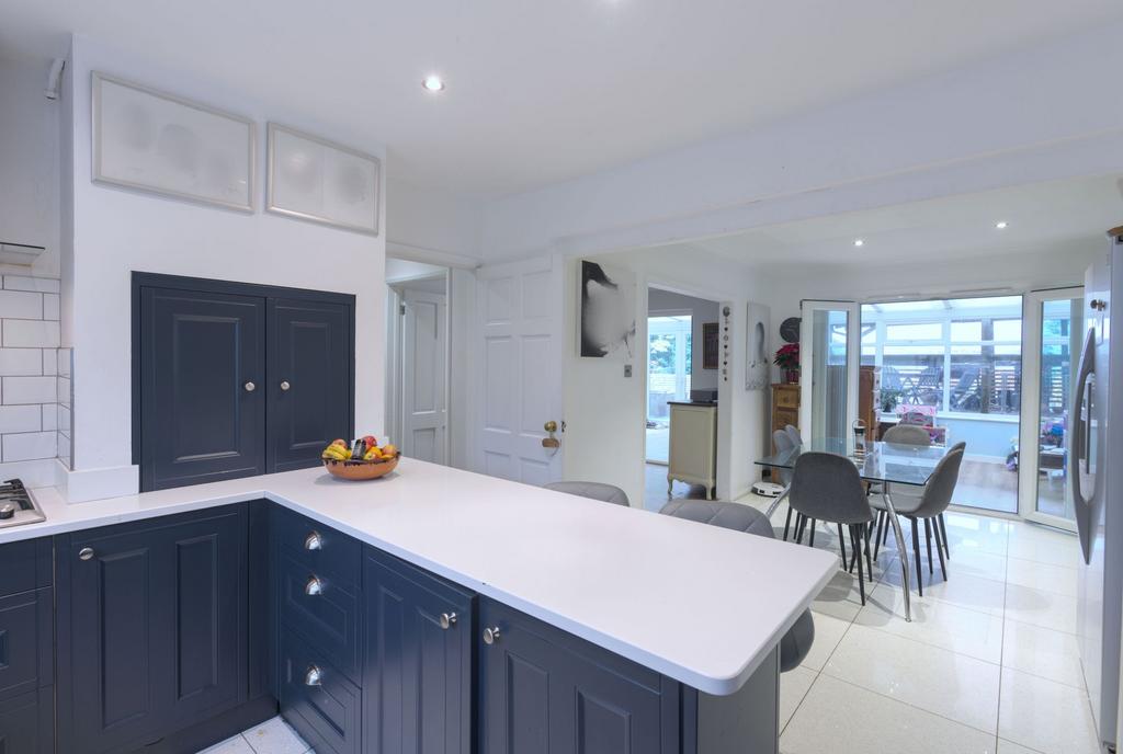 Leading off from the entrance hall is the open plan kitchen/dining room. The kitchen is stylish and modern, featuring navy Shaker-style cabinetry with contrasting subway tile splashbacks, quartz worktops and floor tiles, all in crisp white. Integrated appliances include a gas hob with stainless steel wall-mounted hood, dishwasher and wall-mounted double electric ovens, and there is space for a fridge-freezer and dishwasher. The breakfast bar provides additional seating space – perfect for enjoying that first freshly brewed coffee of the day, well-earned glass of wine in the evening, or simply for friends to sit and chat whilst you prepare a meal. Leading off from the kitchen is an incredibly generous 21’ utility room with access to both the front and rear gardens – a fantastic asset, particularly if you are dealing with muddy dogs or children!