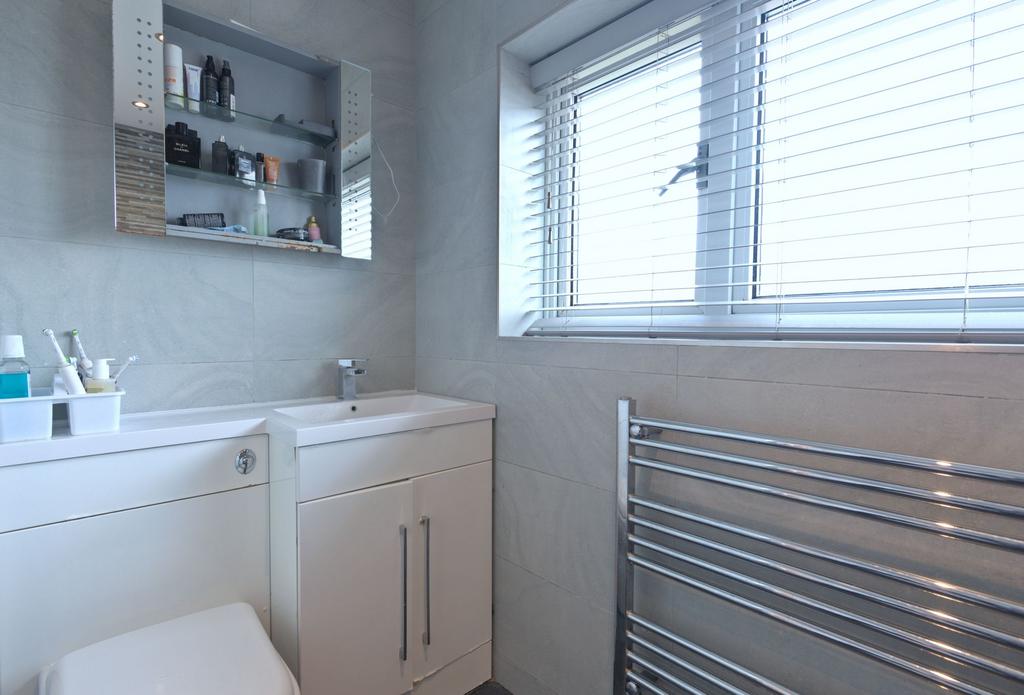 Upstairs, the property has four well-proportioned double bedrooms which benefit from large windows making them wonderfully bright and airy. The principal bedroom is of a generous size, with lovely countryside views through its double windows and large fitted mirrored wardrobes. Two of the other bedrooms also enjoy fabulous views and all three have built-in wardrobes with plenty of space for additional furniture. The family bathroom is fully tiled with marble-effect and slate-effect wall tiles. It features a white suite, including a large bath with shower over, and chrome heated towel rail.