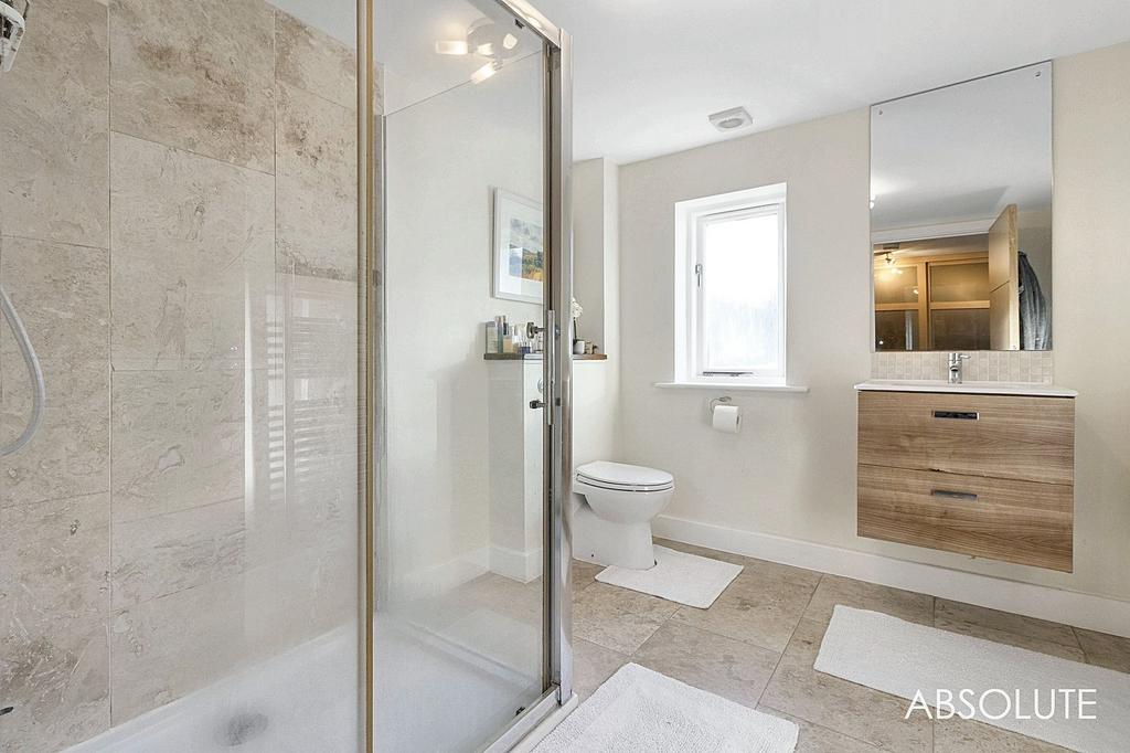 The staircase rises to an impressive galleried first-floor landing with useful storage/linen cupboard. The principal suite is a standout feature of the property: a spacious double bedroom with two Velux roof windows and an additional front window, creating a wonderfully bright retreat. A dressing room with fitted wardrobes leads through to a stylish en suite, fitted with a large walk-in shower with thermostatic control, wall-hung vanity unit with inset basin, WC with concealed cistern and obscured double-glazed window.