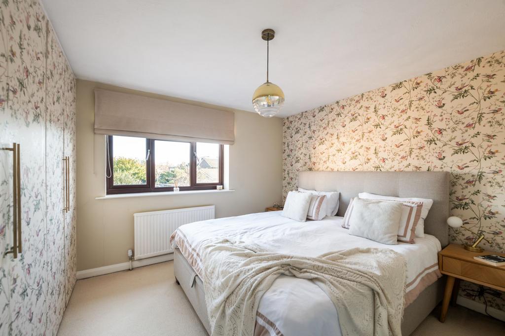 Upstairs, the property comprises three well-proportioned bedrooms, each benefitting from large windows and a contemporary finishes to create comfortable personal retreats. The modern family bathroom is appointed with a walk-in shower, separate bath-tub, stylish fixtures, and natural light, ensuring both comfort and functionality. Outside, the property continues to impress with a beautifully maintained front garden, a welcoming covered porch, and ample driveway parking in addition to the garage. The rear garden is a true highlight, offering a generous lawn, a charming patio area for outdoor dining. Mature trees, carefully landscaped borders, and wood storage add character and practicality to this serene outdoor haven.