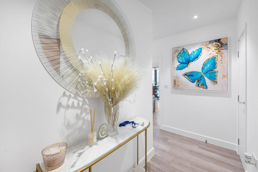 Up on the 12th floor, inside is light and bright owing to large floor to ceiling windows/French doors and windows.