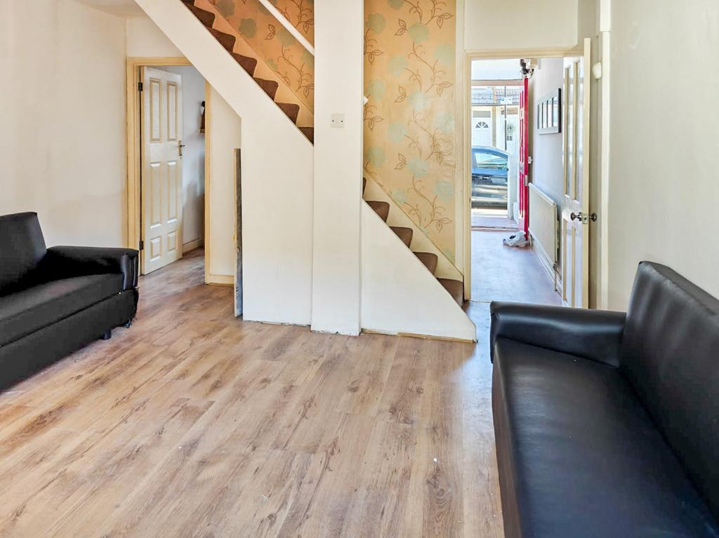 A double glazed window and door to the garden, wood effect panelled flooring, a radiator and stairs to the first floor landing.