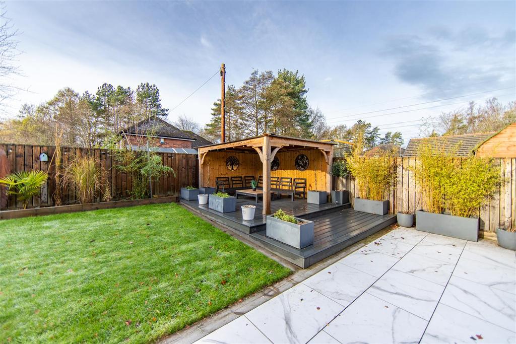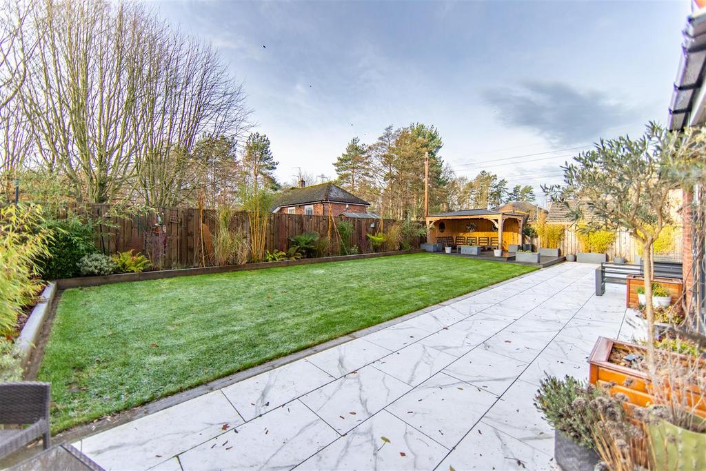 Externally the south facing rear garden is a real showstopper meticulously landscaped and designed for both relaxation and entertaining. A large porcelain-tiled terrace spans the back of the home, providing ample seating and dining space. To the far corner stands a bespoke timber garden pavilion, complete with decking.