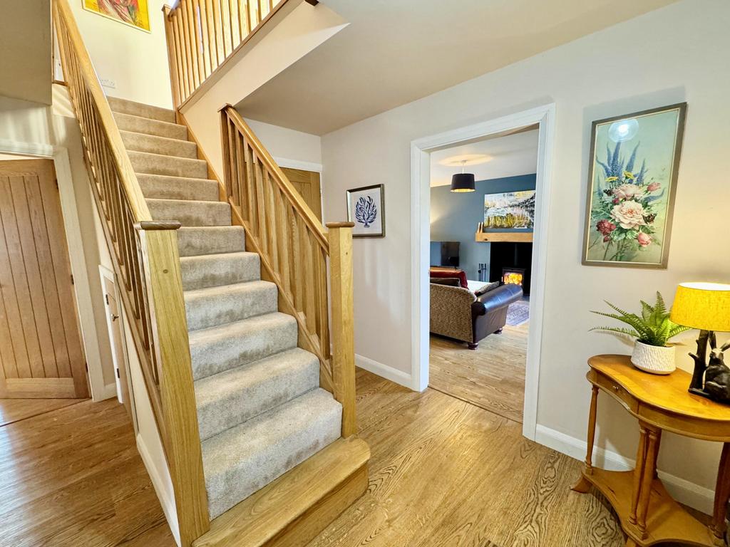 The main living room offers a calm and inviting retreat, centred around a charming log burner and complemented by French doors opening onto the garden. A further reception room provides flexibility for a snug, playroom or formal sitting room, alongside a utility room, refined reception hallway and a conveniently positioned ground floor cloakroom.